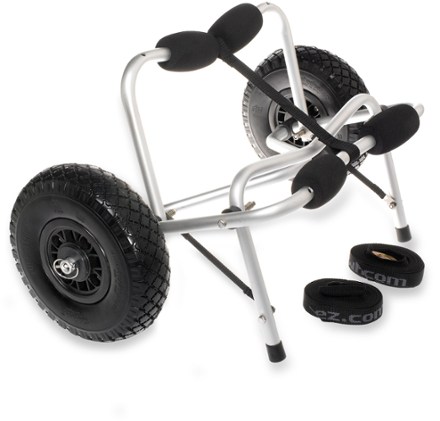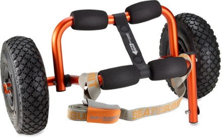 There's also the Seattle Sports Nemo Extremo Center Cart that some folks have had success with. It looks super-rugged, also has foam-filled tires, and sells for $140, although not through REI. 7.5 lbs. The more I look at this cart, though, the more dubious I am about those wheels. It looks as though the wheels are bolted directly onto the cart, relying on those plastic bushings to bear the shear stress. The other frames, you'll notice, have a bar going through the wheel hubs, distributing the weight more easily and being WAY nicer to the bearings. After hearing stories about plastic bearings doing a meltdown, I think I'll pass. Shame, though: this guy definitely folds up the most compactly...